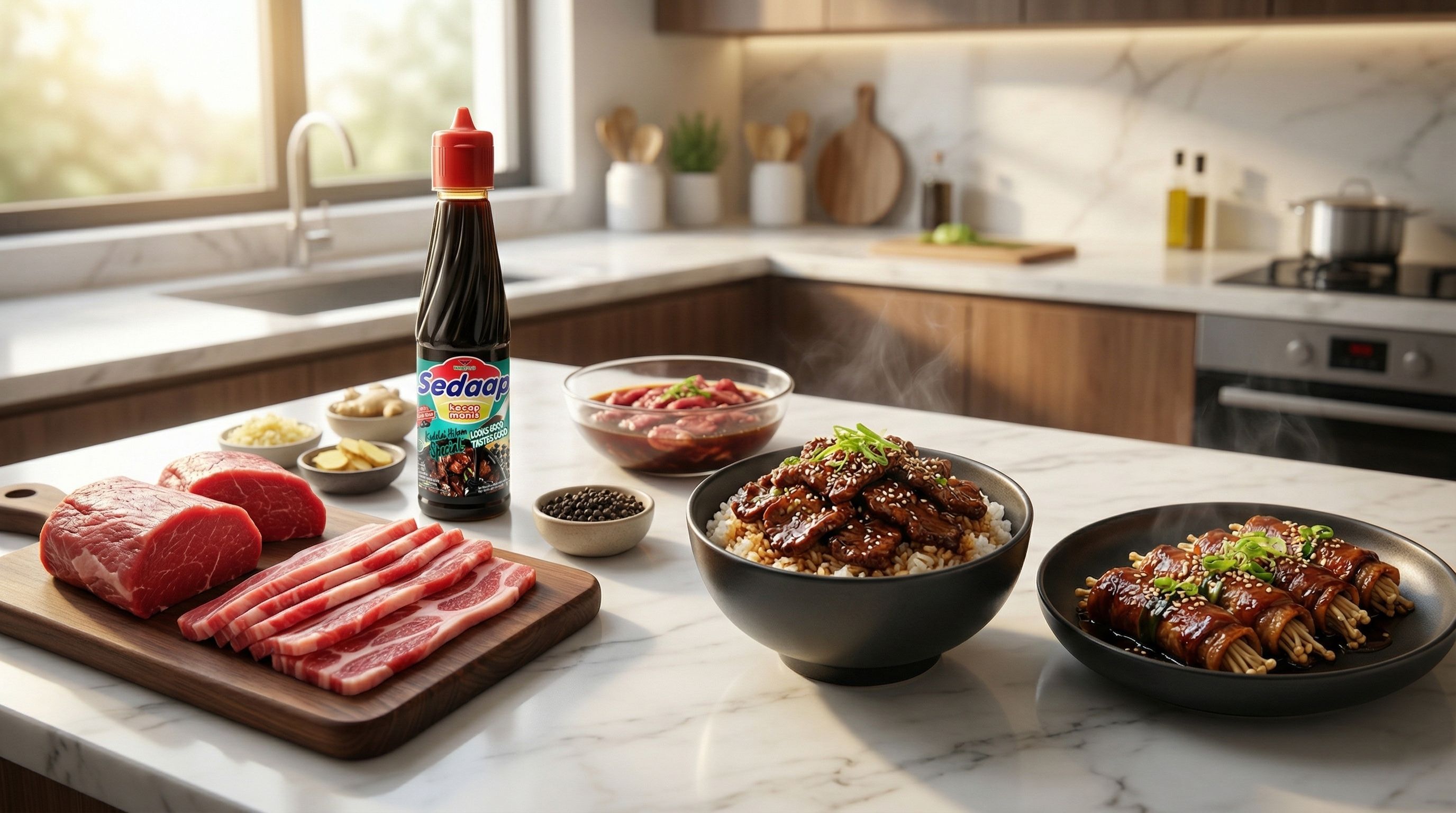 Satu botol, banyak fungsi. Mulai dari saus teriyaki yang manis, bulgogi yang bold, rendang kaya rempah, hingga glaze yang so caramelized ala restoran Barat. Kecap Sedaap Kedelai Hitam Special menjadi jembatan antara masakan Jepang, Korea, Timur Tengah, Italia, dan Amerika sekaligus. Investasi terbaik untuk perjalanan fusion food kamu.